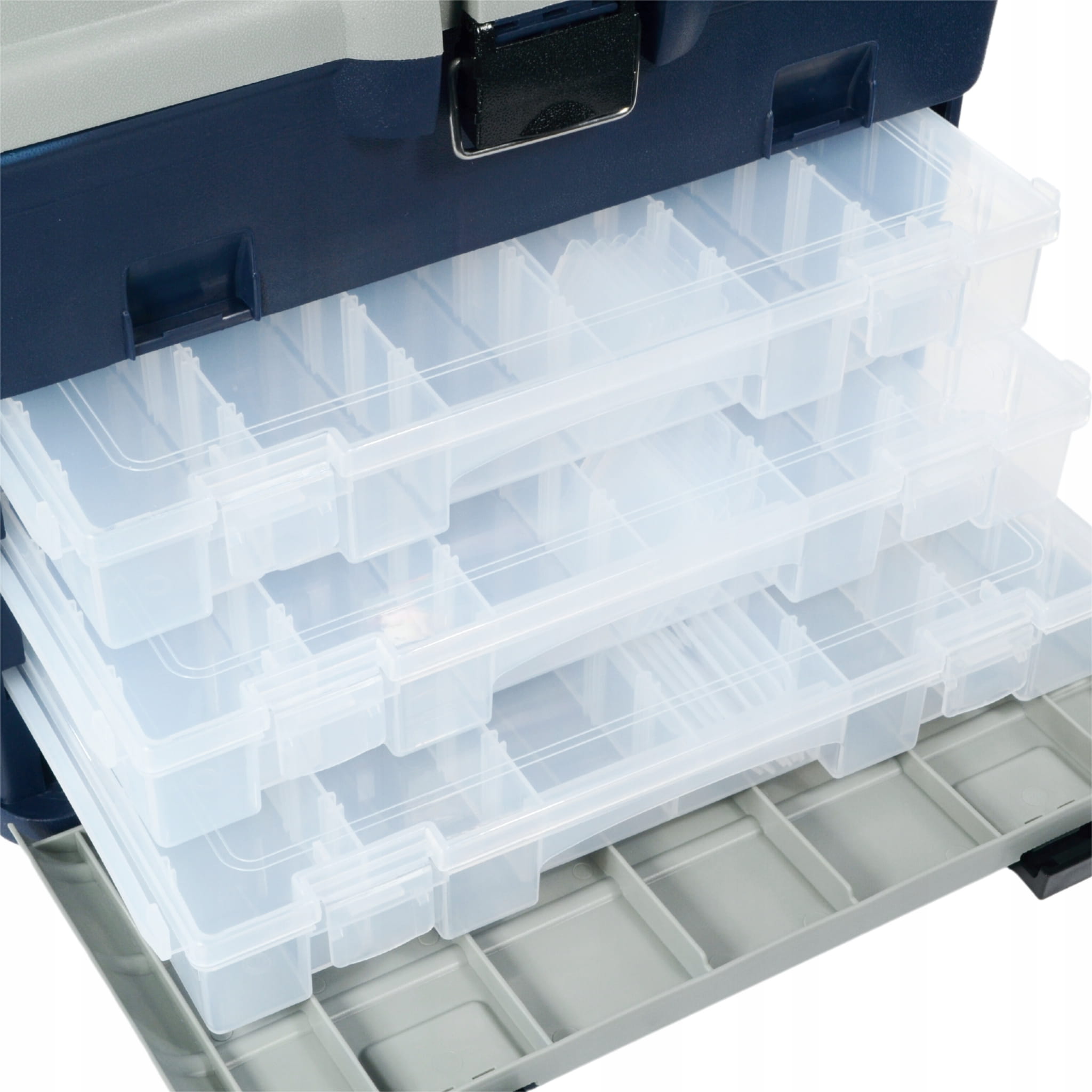 - Poziom drugi, mieszczący trzy pudełka wędkarskie z możliwością indywidualnego rozmieszczenia przegródek. Każde pudełko ma wymiar: 30cm x 17,5cm x 4,5cm.
